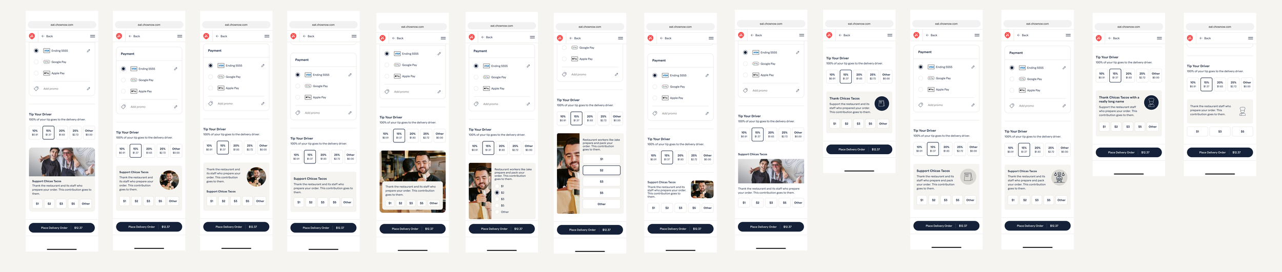 Evolve the previous explorations to incorporate more brand personality and make the tipping feature more noticeable to diners. The pilot test for this feature would be on web, so post-order push notifications would not be an option and round up would not have enough restaurant impact, so a flat dollar amount was a requirement.