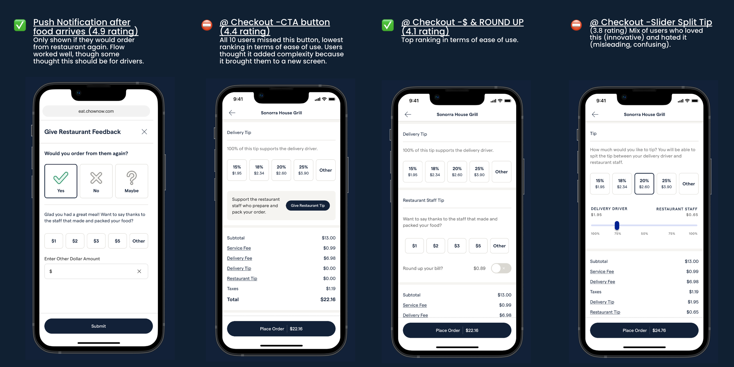 Six months before I joined the project, another designer had conducted user research and low-fidelity testing for this feature to understand timing, interactions, and overall willingness to tip. The testing had positive results and sentiment with diners and she left me with her explorations and some suggestions based on user feedback.